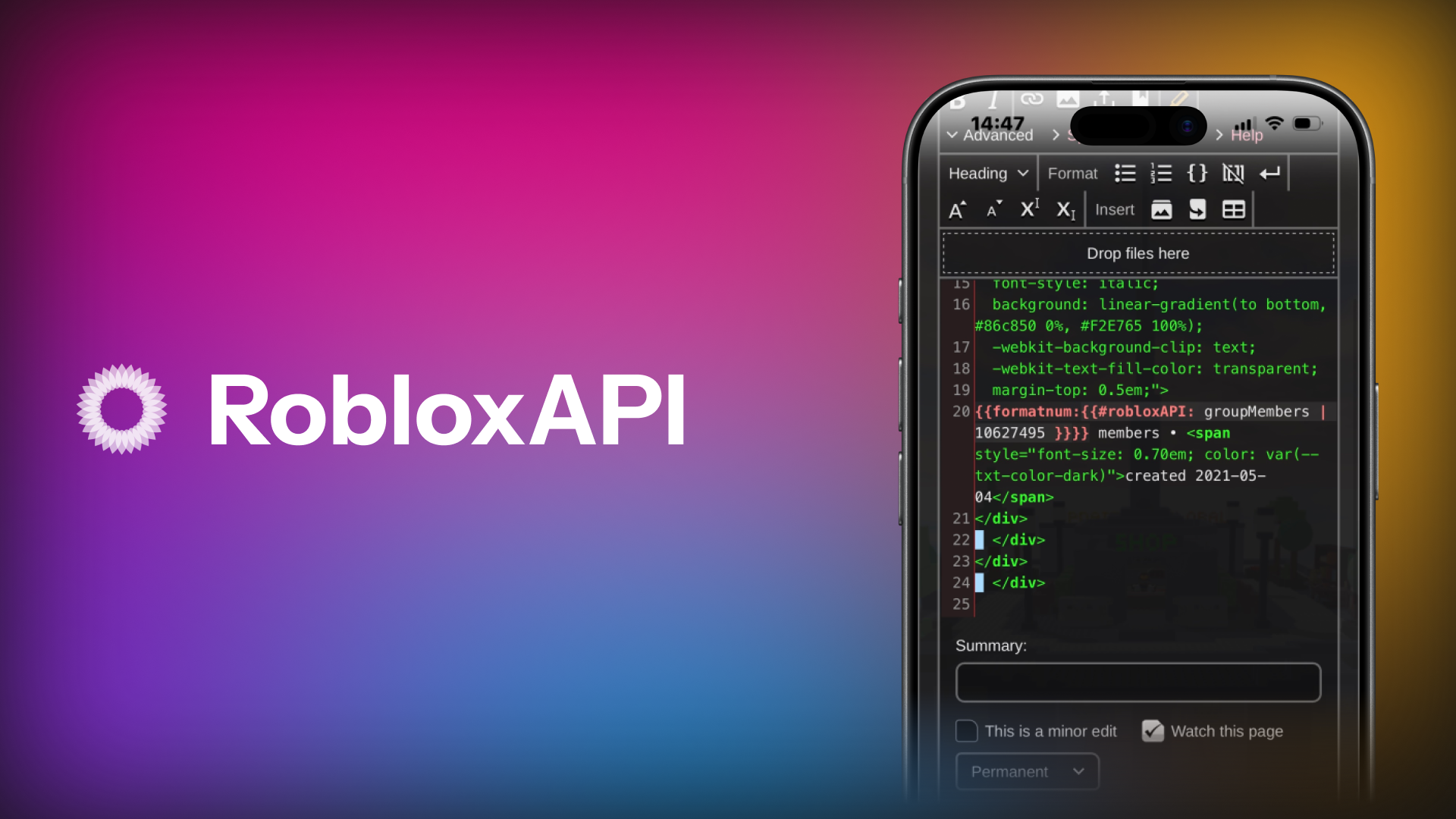 The RobloxAPI extension provides easy access to the Roblox API via parser functions. The Roblox API is generally very poorly documented, and using the ExternalData extension or Lua modules can be a steep learning curve which may not be viable. This extension aims to make it easy for you to grab data from Roblox and put it on your wiki, using simple parser functions.